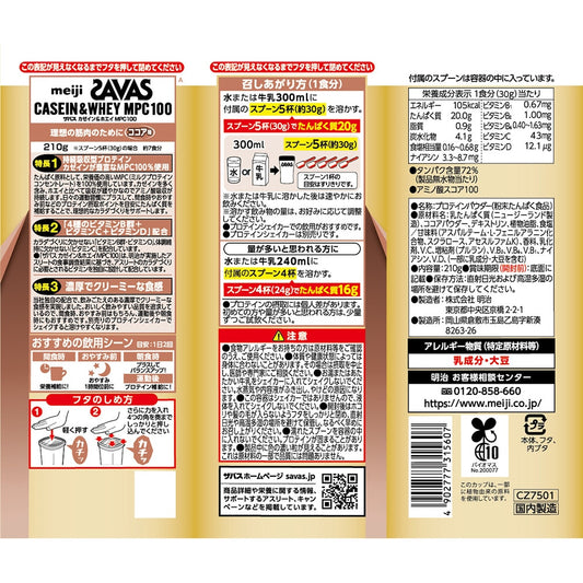 ザバス/ココア味+210g 約7回分 カゼイン&ホエイ MPC100 4種のビタミンB群 ビタミンC ビタミンD配合 2631560