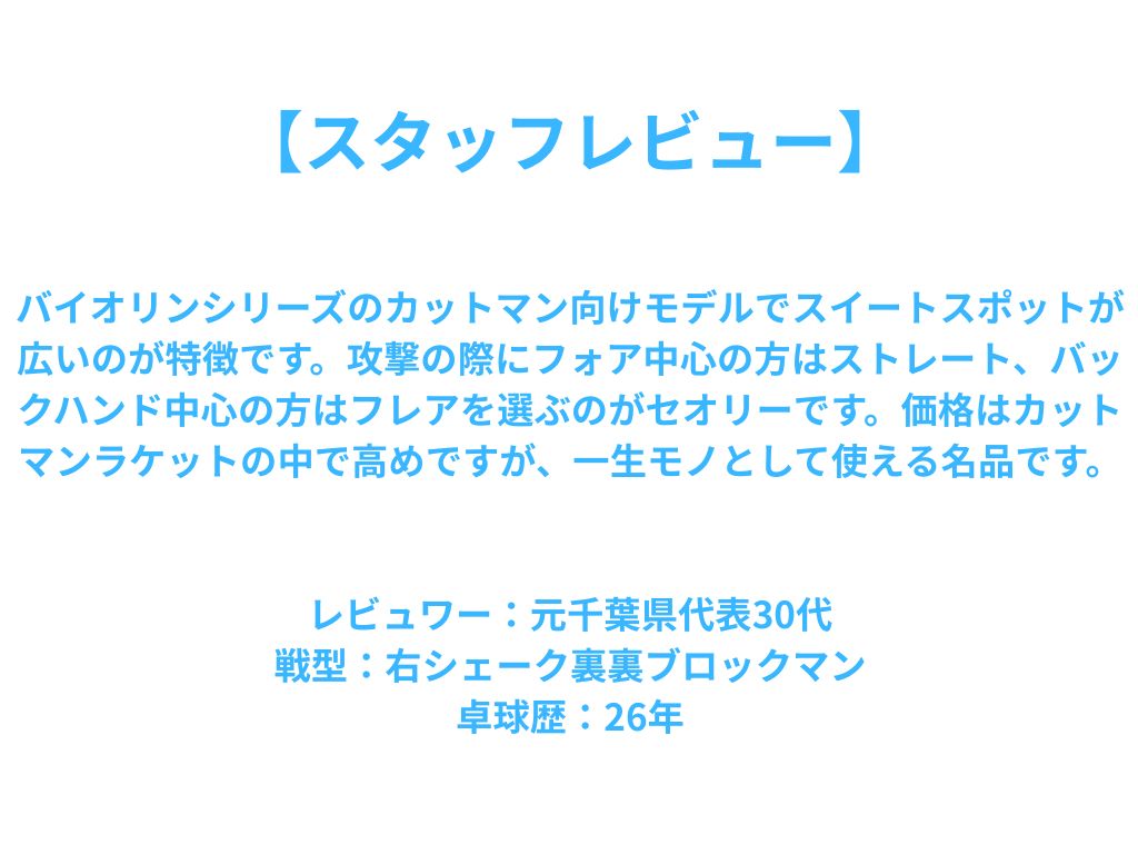 バイオリンシリーズのカットマン向けモデルでスイートスポットが広いのが特徴です。攻撃の際にフォア中心の方はストレート、バックハンド中心の方はフレアを選ぶのがセオリーです。価格はカットマンラケットの中で高めですが、一生モノとして使える名品です。