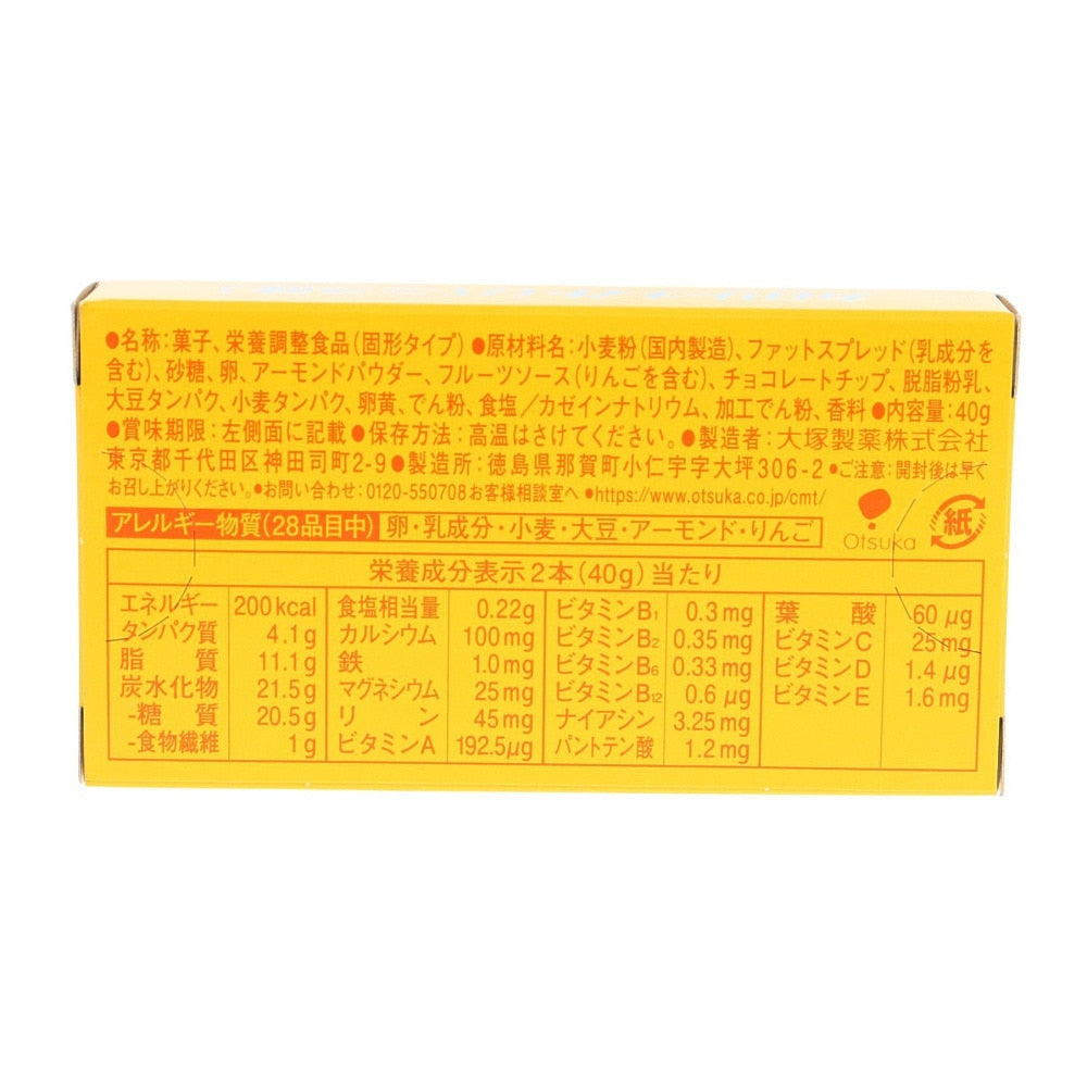 ●栄養成分表示:(2本(40g)当たり)エネルギー 200kcal/タンパク質 4.1g/脂質 11.1g/炭水化物 21.5g/-糖質 20.5g/-食物繊維 1g/食塩相当量 0.22mg/カルシウム 100mg/鉄 1.0mg/マグネシウム 25mg/リン 45mg/ビタミンA 192.5μg/ビタミンB1 0.3mg/ビタミンB2 0.35mg/ビタミンB6 0.33mg/ビタミンB12 0.6μg/ナイアシン 3.25mg/パントテン酸 1.2mg/葉酸 60μg/ビタミンC 25mg/ビタミンD 1.4μg/ビタミンE 1.6mg