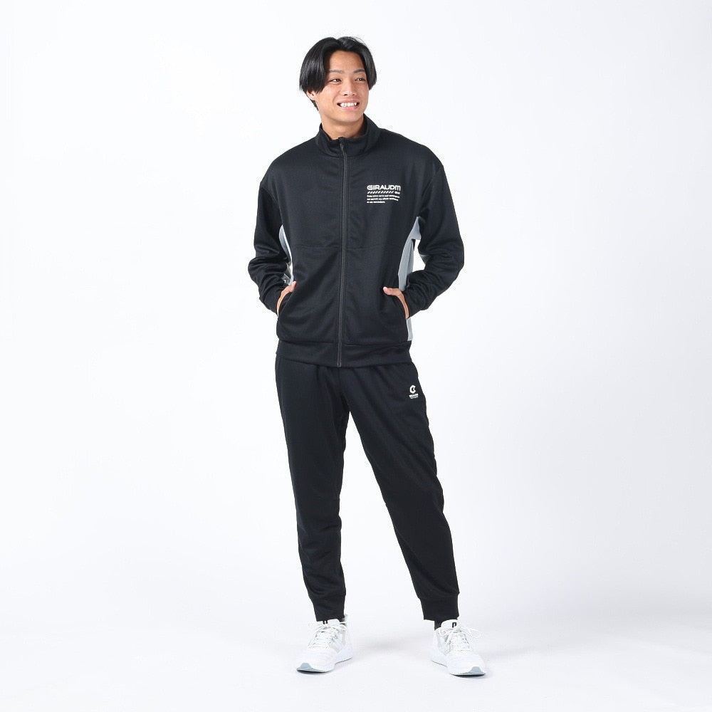 ●スタンドカラーフルzipジャケット。動きやすい軽量ニット素材を使用。UVカット加工により野外でのトレーニングにも対応しています。