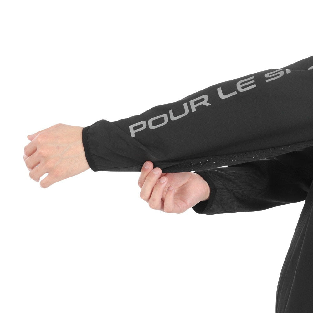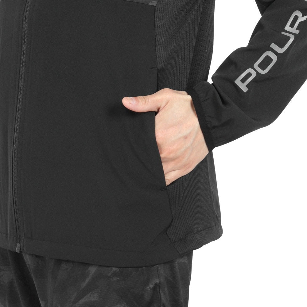 ●部分的にプリント生地を使用したスタンドカラーフルzipジャケット。動きやすい軽量ストレッチ素材を使用。さらに絶耐撥水加工により雨天のトレーニングにも対応しています。