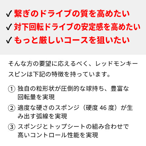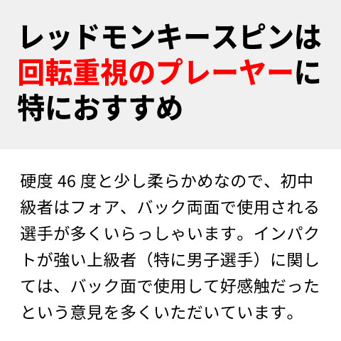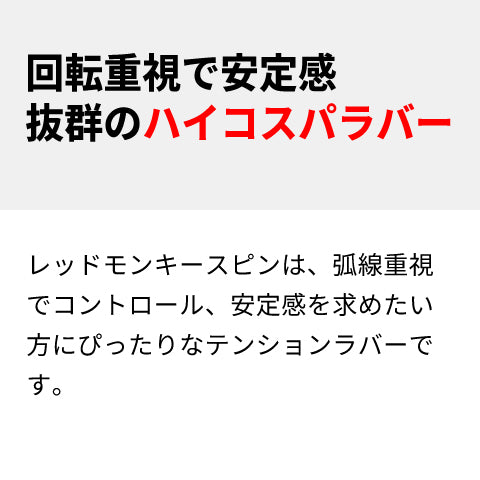 Rallysラバー第2弾「REDMONKEY Spin(レッドモンキースピン)」は、アンバサダー含む多くの選手からのフィードバックを基に誕生したハイコスパテンションラバーです。