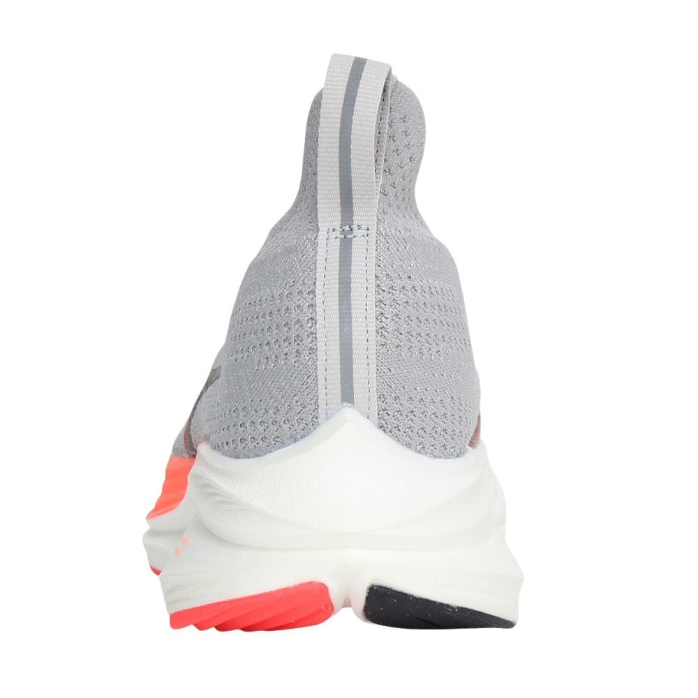 ●柔らかいニットアッパーがランナーの足にやさしくなじみ、包み込む。ブーティ構造のシームレスなアッパーはトレーニングに最適なフィット感を提供するとともに、パーツ数を最小限にすることで軽量化にも貢献。