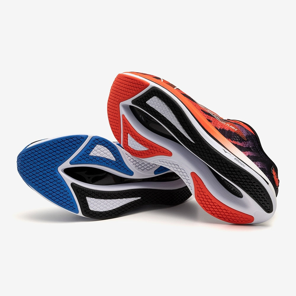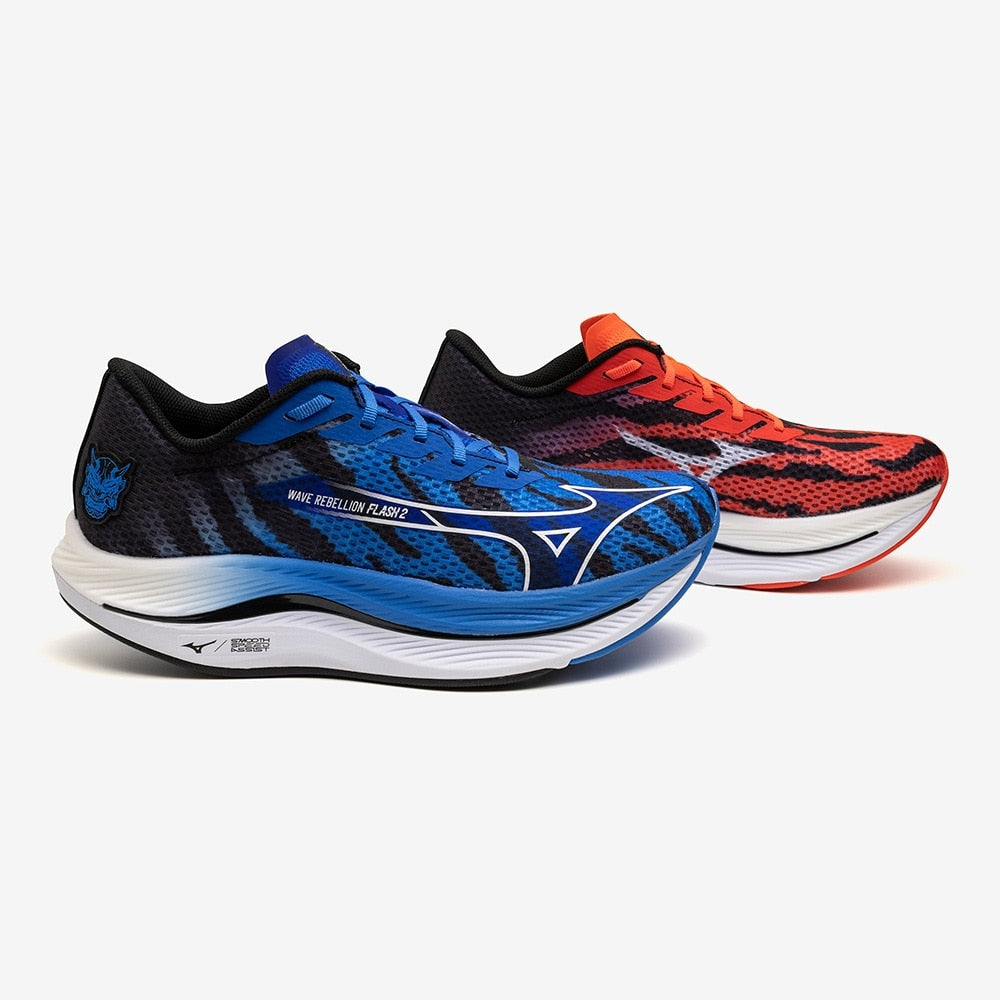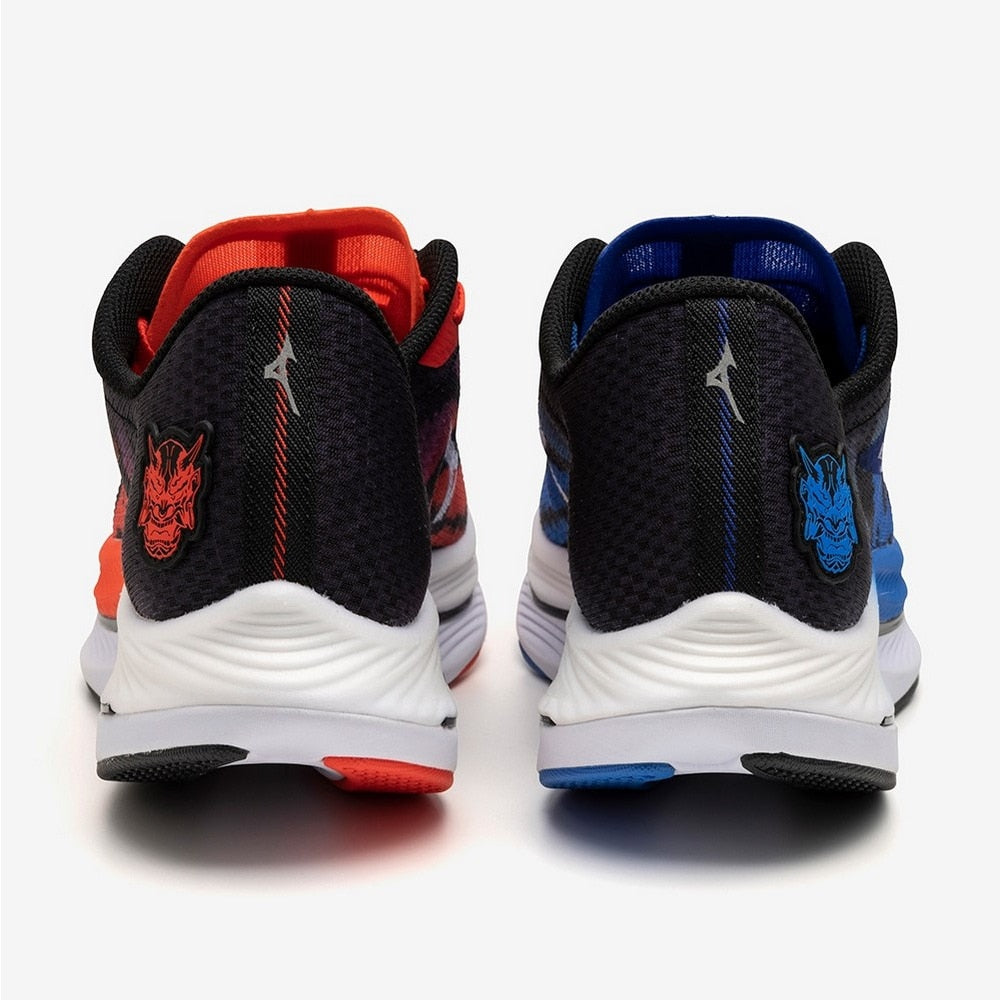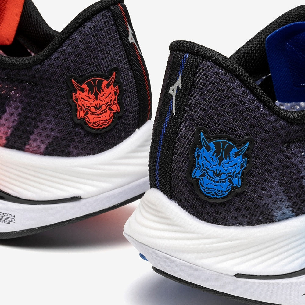 ●初代リベリオンプロで好評を得た最新機能がついにフラッシュにも搭載。高コスパレーシングシューズに進化。冷静にペースを保つ「青鬼」と、情熱で限界を出し切る「赤鬼」を左右非対称のデザインで表現。