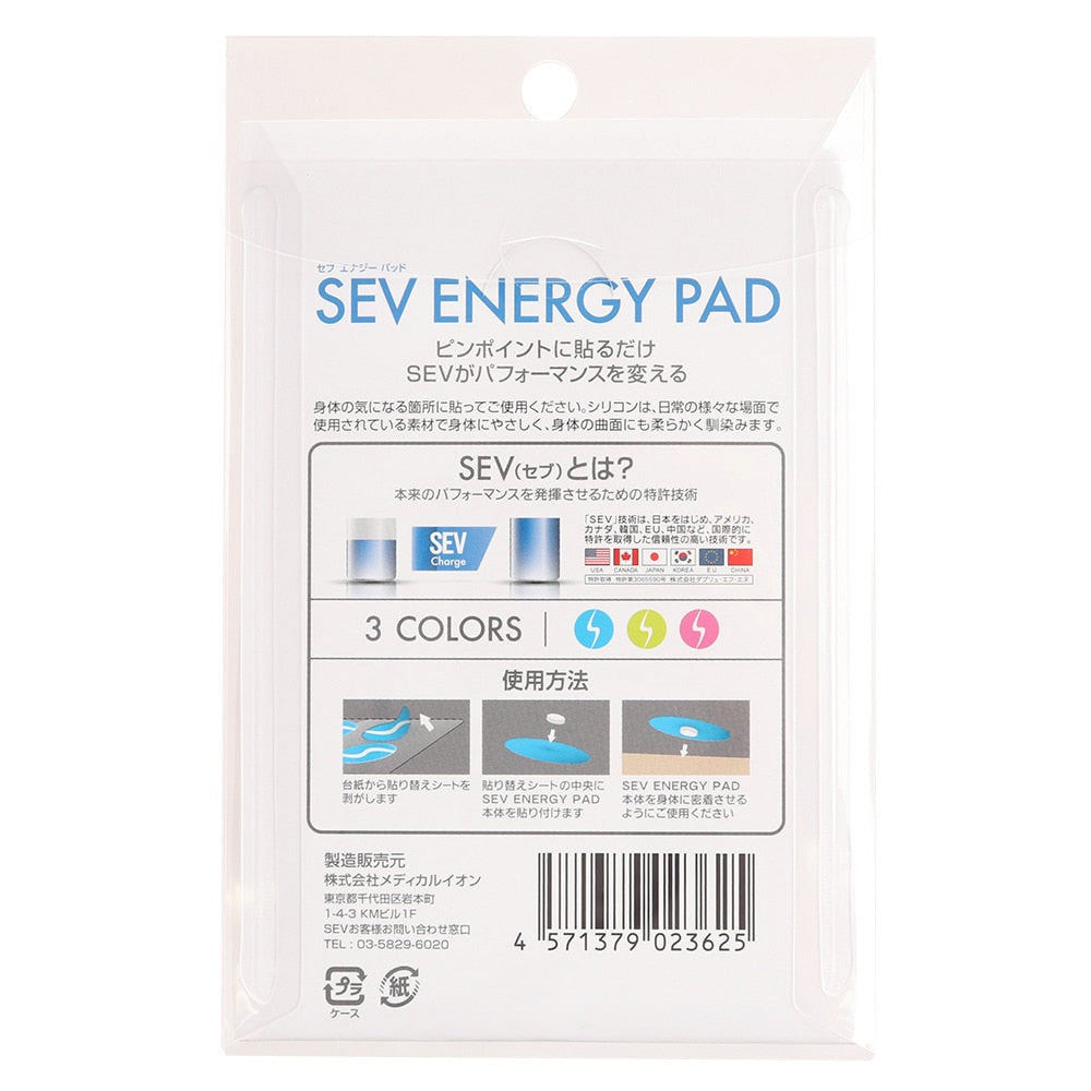 ●SEV ENERGY PADとは:「SEV ENERGY PAD」は、シリコン素材の中にSEV特許技術と新しいナノSEV技術を使用したSEV素材を配合し、円形状に加工したものです。カラダの気になる箇所に貼ってご使用ください。シリコンは、日常の様々な場面で使用されている素材でカラダにやさしく、カラダの曲面にも柔らかく馴染みます。SEV ENERGY PADの本体は両面使用できます。また専用貼り替えシートを取り替えるだけで、SEV ENERGY PAD本体はくり返し使用できます。