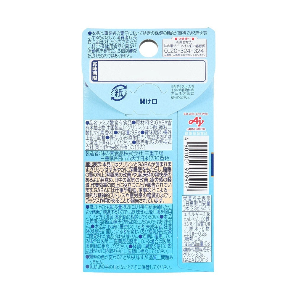 ●栄養成分表示:【1日摂取目安量1本(3.3g)あたり】エネルギー 13kcal/たんぱく質 3.2g/脂質 0g/炭水化物 0.01g〜0.2g(糖類:0g)/食塩相当量 0g 【機能性関与成分】グリシン 3.0g/GABA 100mg