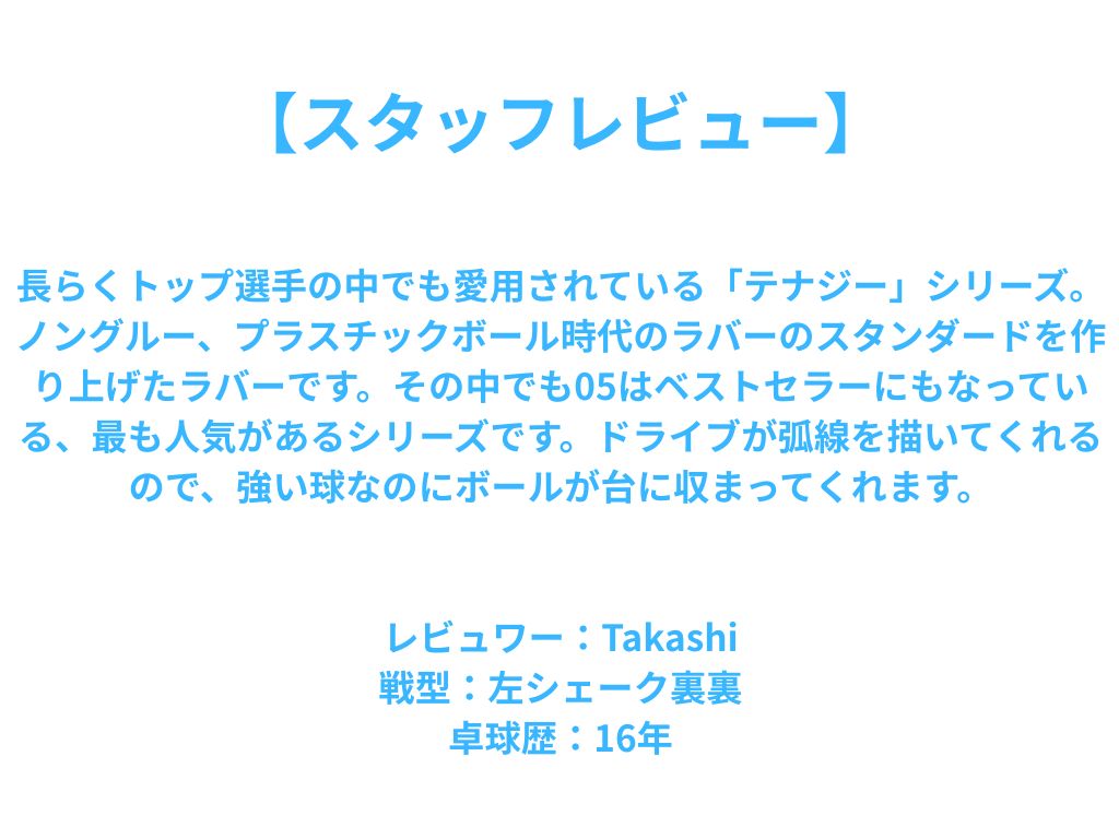長らくトップ選手の中でも愛用されている「テナジー」シリーズ。ノングルー、プラスチックボール時代のラバーのスタンダードを作り上げたラバーです。その中でも05はベストセラーにもなっている、最も人気があるシリーズです。ドライブが弧線を描いてくれるので、強い球なのにボールが台に収まってくれます。